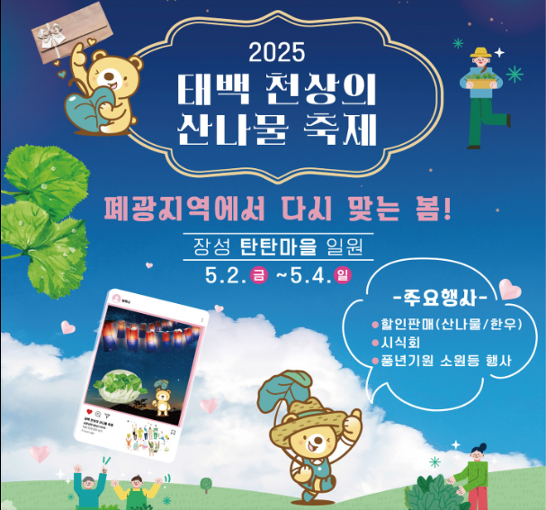 - 해발 1,000m 고원 도시 태백에서 열리는 산나물 축제는 향긋한 봄의 맛을 느낄 수 있는 행사입니다.