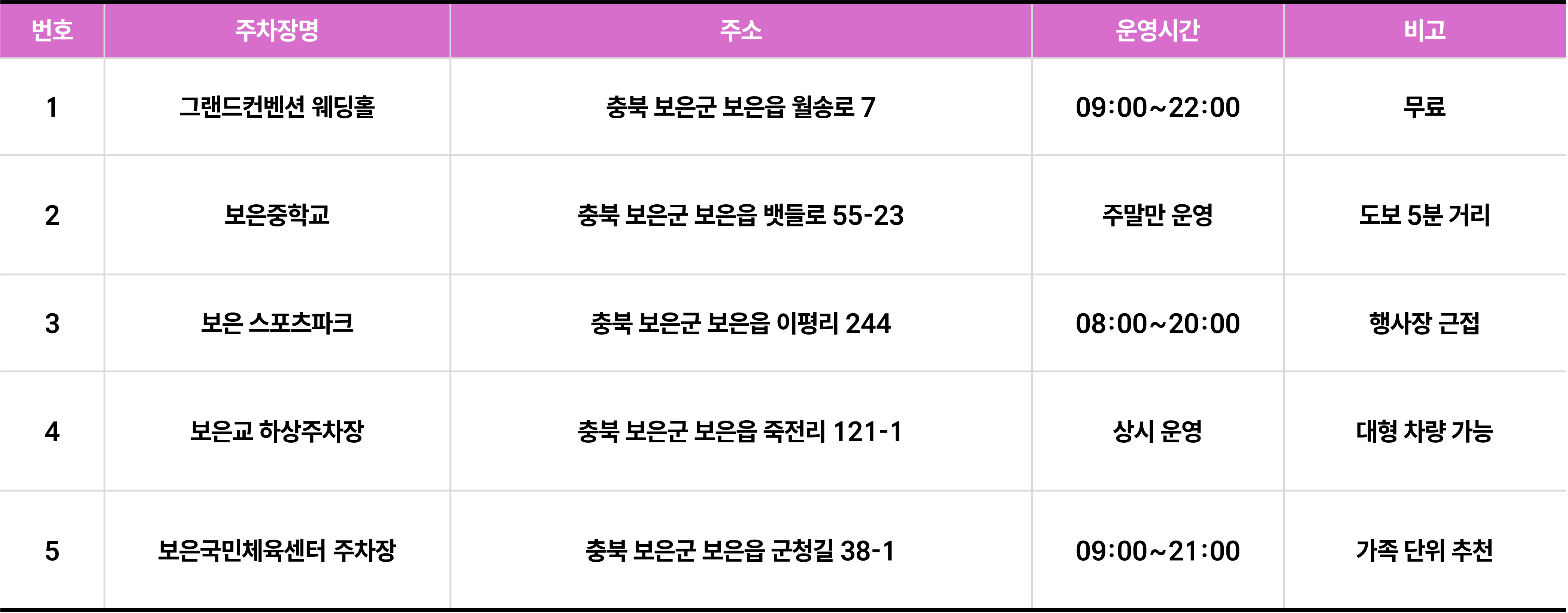 - 보은군은 대중교통으로도 쉽게 접근할 수 있지만, 자가용 이용 시 행사장 인근에 주차장이 마련되어 있습니다. - 주말에는 혼잡할 수 있으니 일찍 도착하는 것을 추천합니다.
