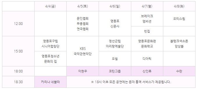 - 봄꽃 스테이지: 대중음악, 재즈, 국악 등 다양한 장르의 공연이 매일 열립니다.