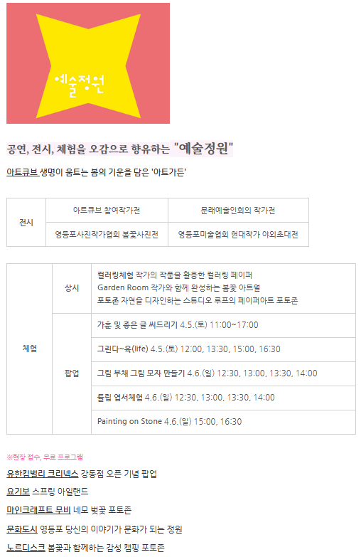 - 예술정원: 지역 작가들의 작품 전시와 함께 창작 체험 활동이 진행됩니다.